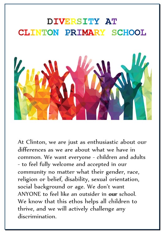 We embrace diversity at Clinton and want everybody to feel that they belong in our school community. We take opportunities to find out about different countries and cultures as part of our desire for us all to be good ‘global citizens’. In addition, through our ‘no outsiders’ work, we ensure that nobody feels like an outsider.